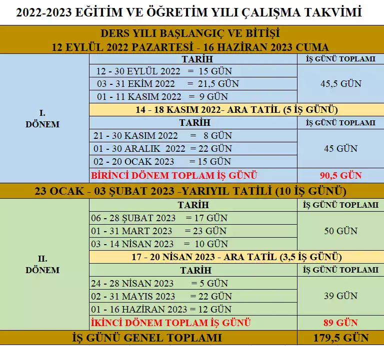 Milli Eğitim Bakanlığı yeni eğitim ve öğretim sezonu için planlamalarını bitirdi. Eğitim sistemindeki çalışma takvimi ülkenin büyük bir çoğunluğunu ilgilendirdiğini düşündüğümüzde erken yayımlanması bir o kadar önemli. 2022-2023 eğitim ve öğretim yılının çalışma ve tatil günlerinin belirtildiği tablo aşağıdaki görselde detaylı bir şekilde belirtilmiştir.